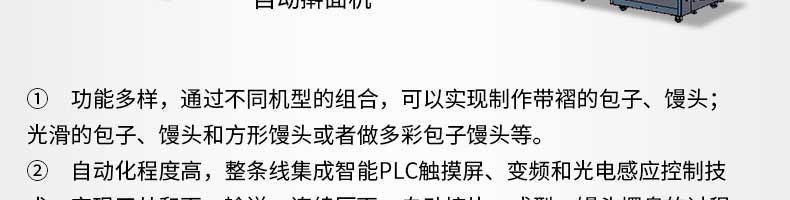 智能包子饅頭生產線,功能多樣,通過不同機型的組合,可以實現制作帶褶的包子、饅頭;光滑的包子、饅頭和方形饅頭或者做多彩包子饅頭等