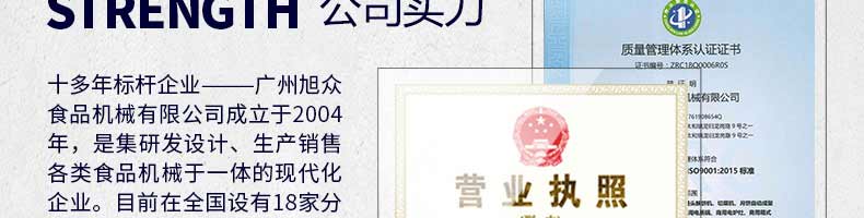 廣州旭眾食品機(jī)械有限公司是一家集科研開發(fā),生產(chǎn)設(shè)計(jì),營銷服務(wù)為一體的現(xiàn)代化生產(chǎn)企業(yè)。現(xiàn)代化生產(chǎn)車間,精湛制造技術(shù),所產(chǎn)機(jī)械歷經(jīng)市場重重考驗(yàn),不斷贏得海內(nèi)外客戶的贊譽(yù)。