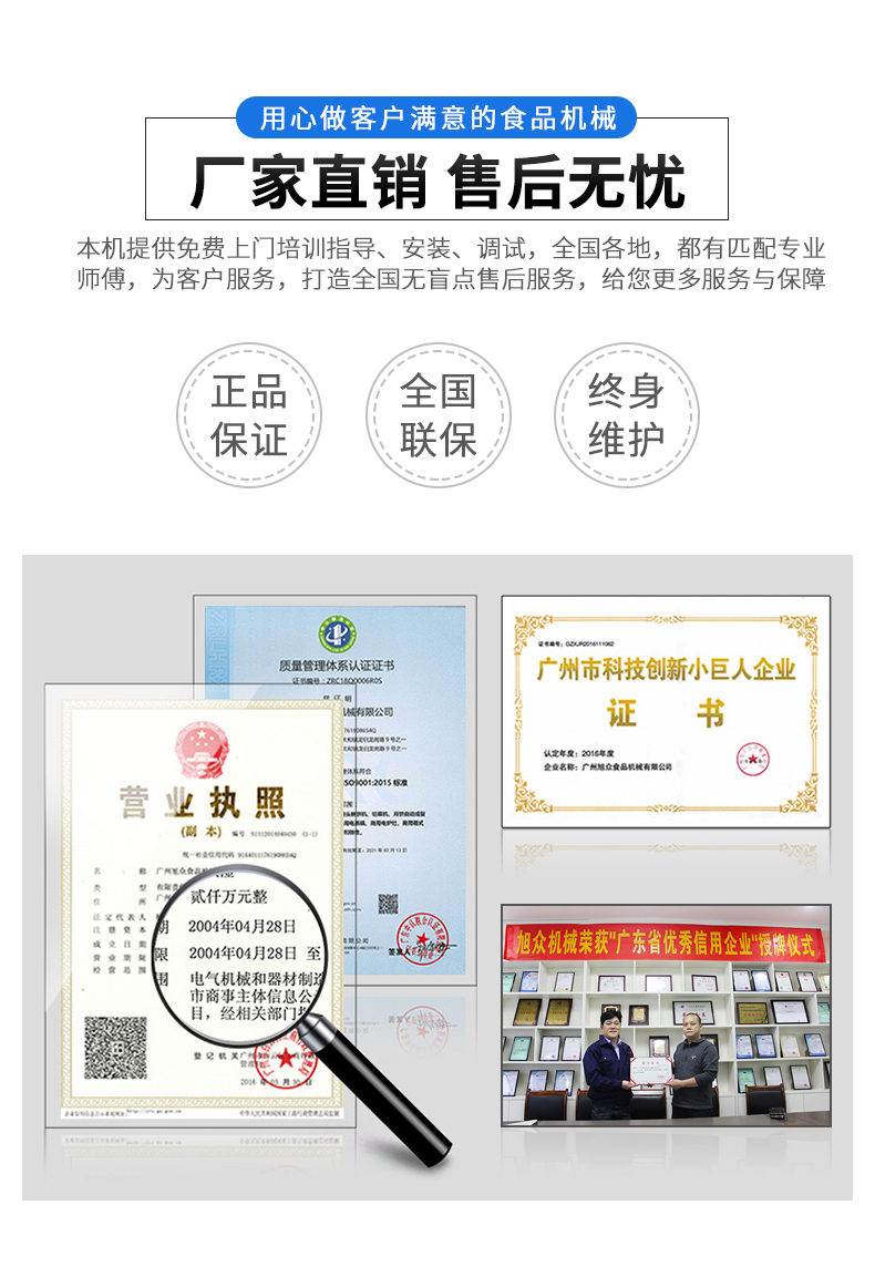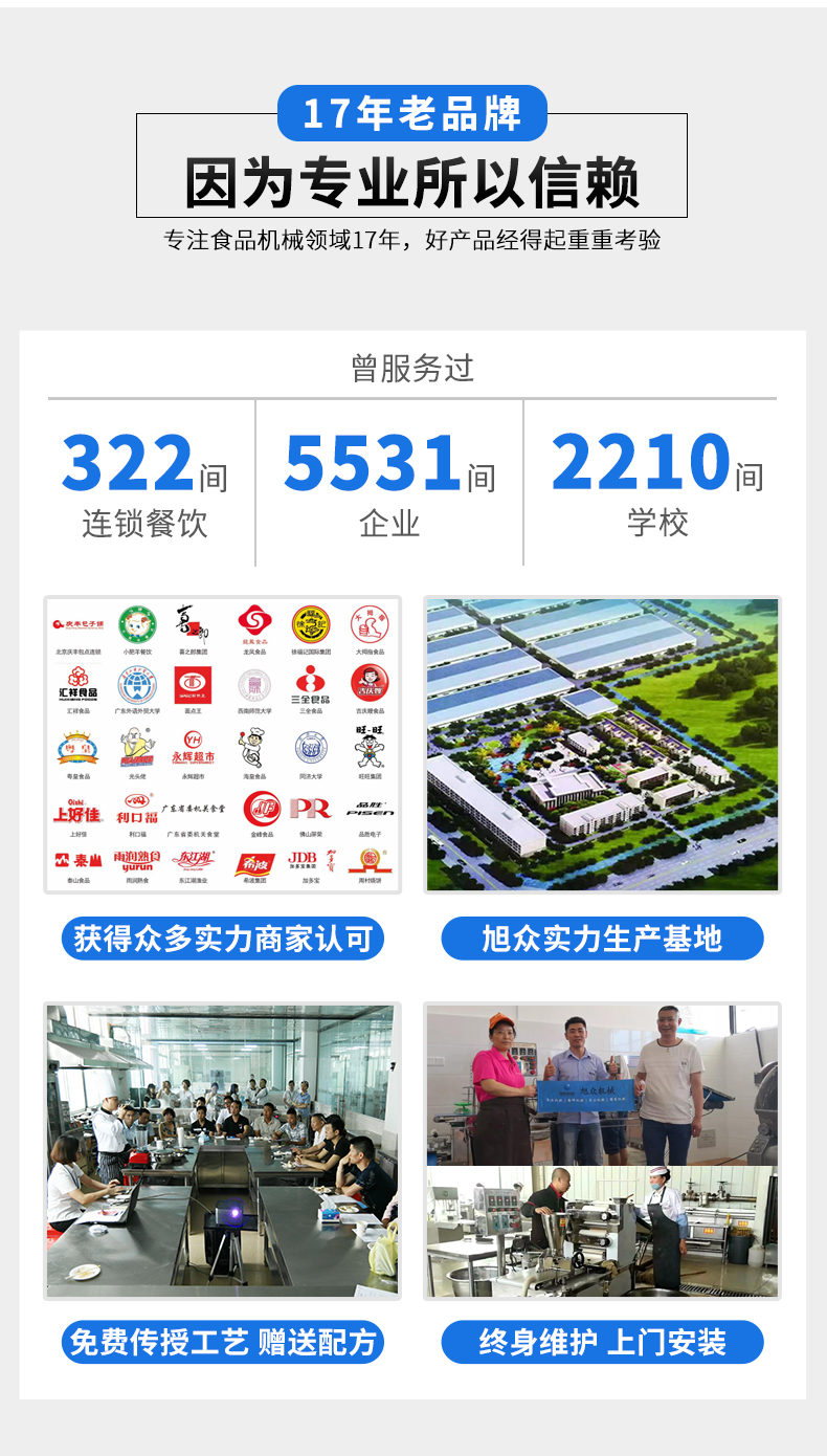 廣州旭眾食品機械有限公司是一家集科研開發(fā),生產(chǎn)設計,營銷服務為一體的現(xiàn)代化生產(chǎn)企業(yè)。現(xiàn)代化生產(chǎn)車間,精湛制造技術,所產(chǎn)機械歷經(jīng)市場重重考驗,不斷贏得海內(nèi)外客戶的贊譽。