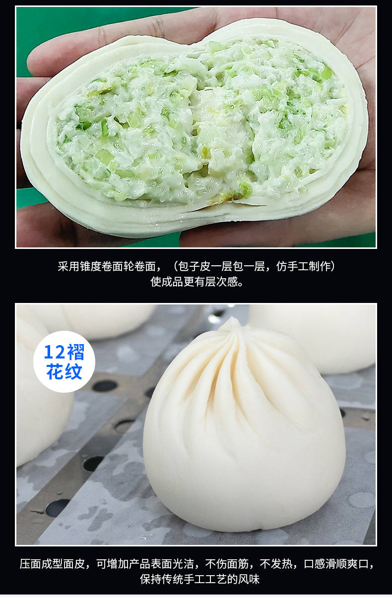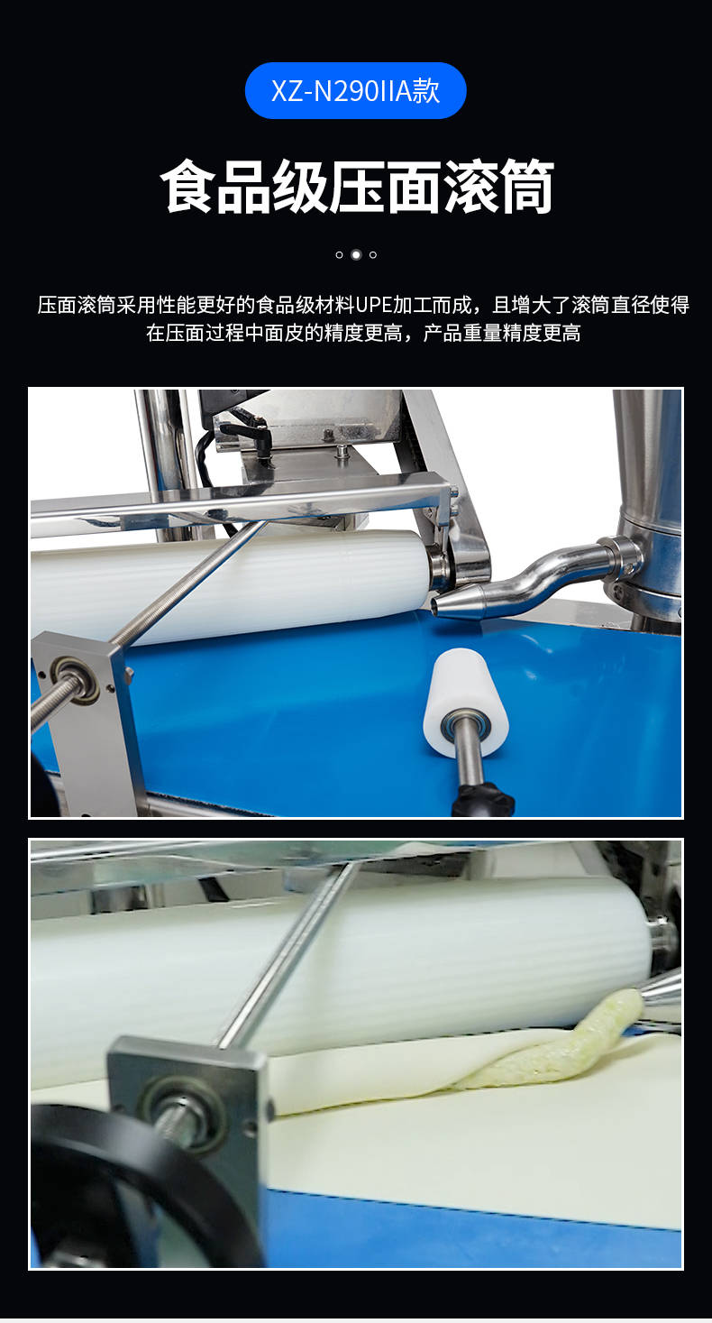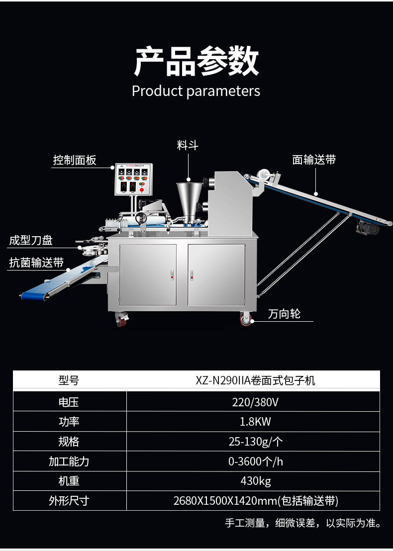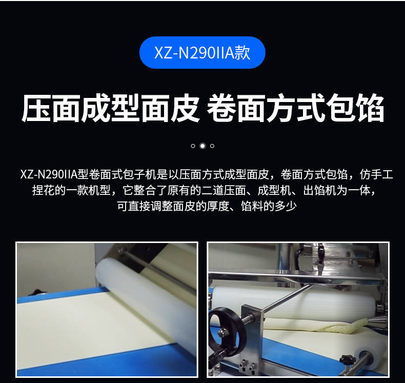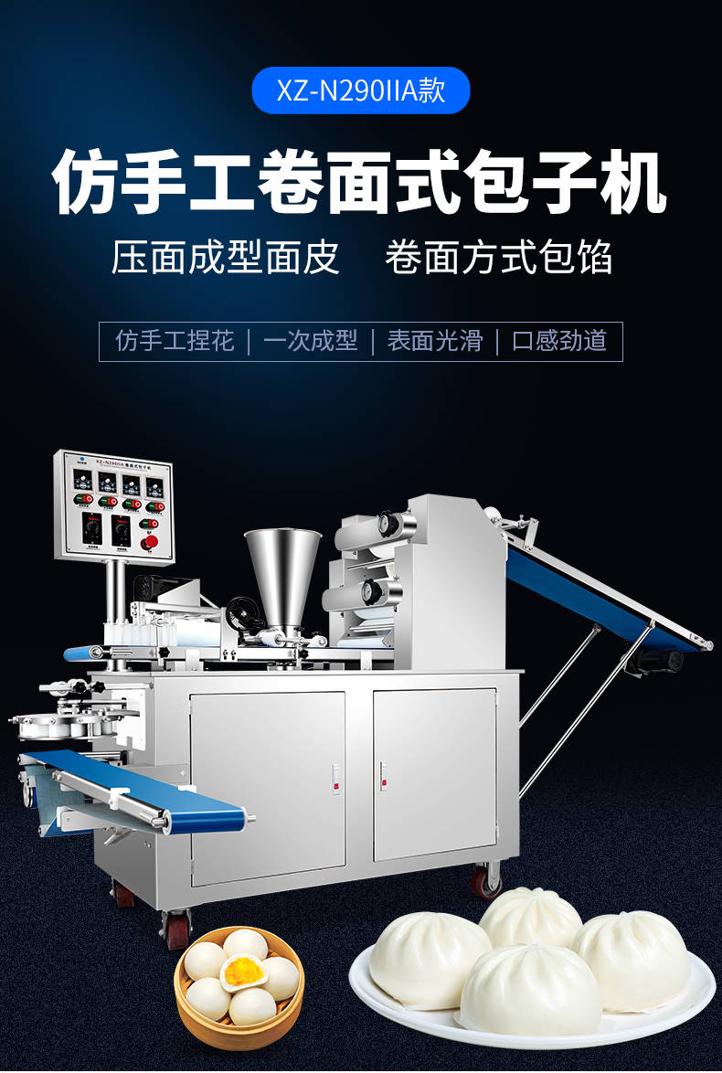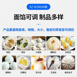 XZ-N290IIA卷面式包子機,壓面成型面皮,卷面方式包餡。仿手工捏花、一次成型、表面光滑、口感勁道。面餡可調、制品多樣。產品重量精度高,規格,大小,面皮的厚度皆可調控。