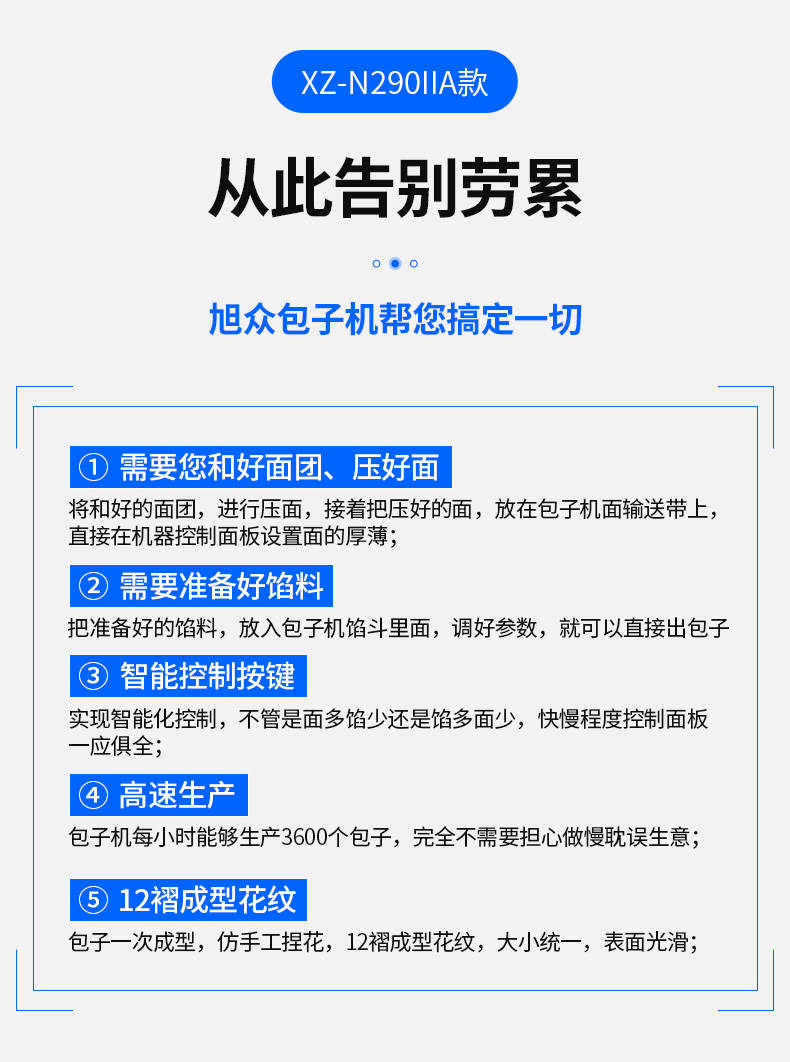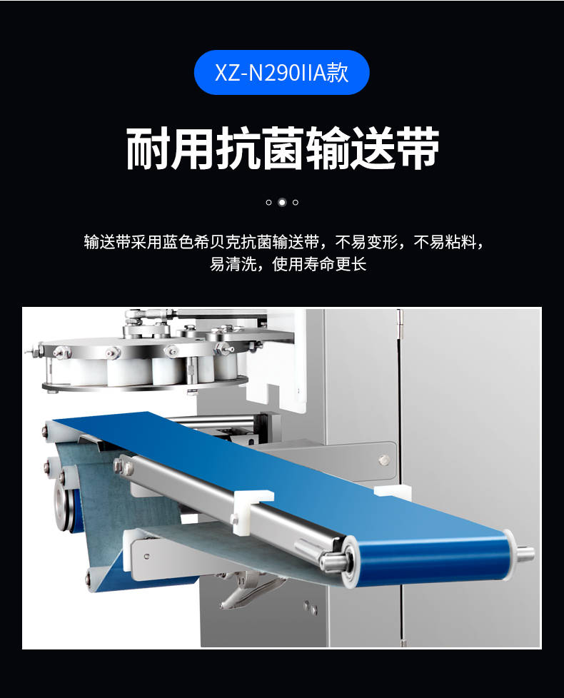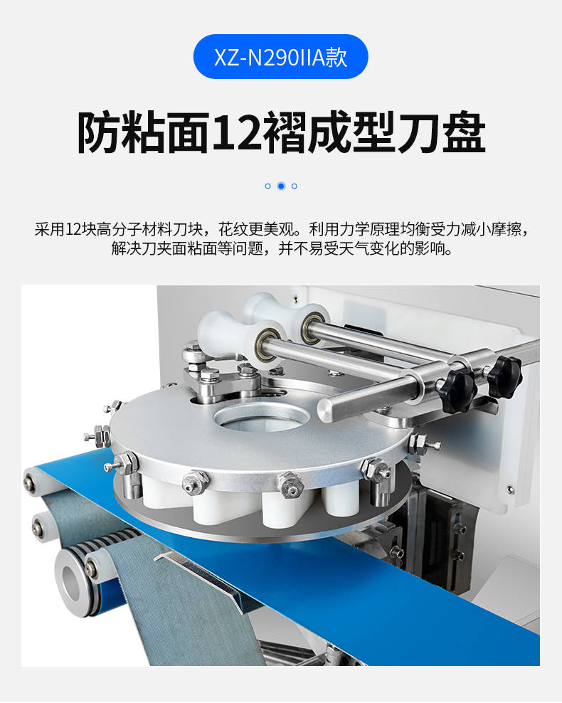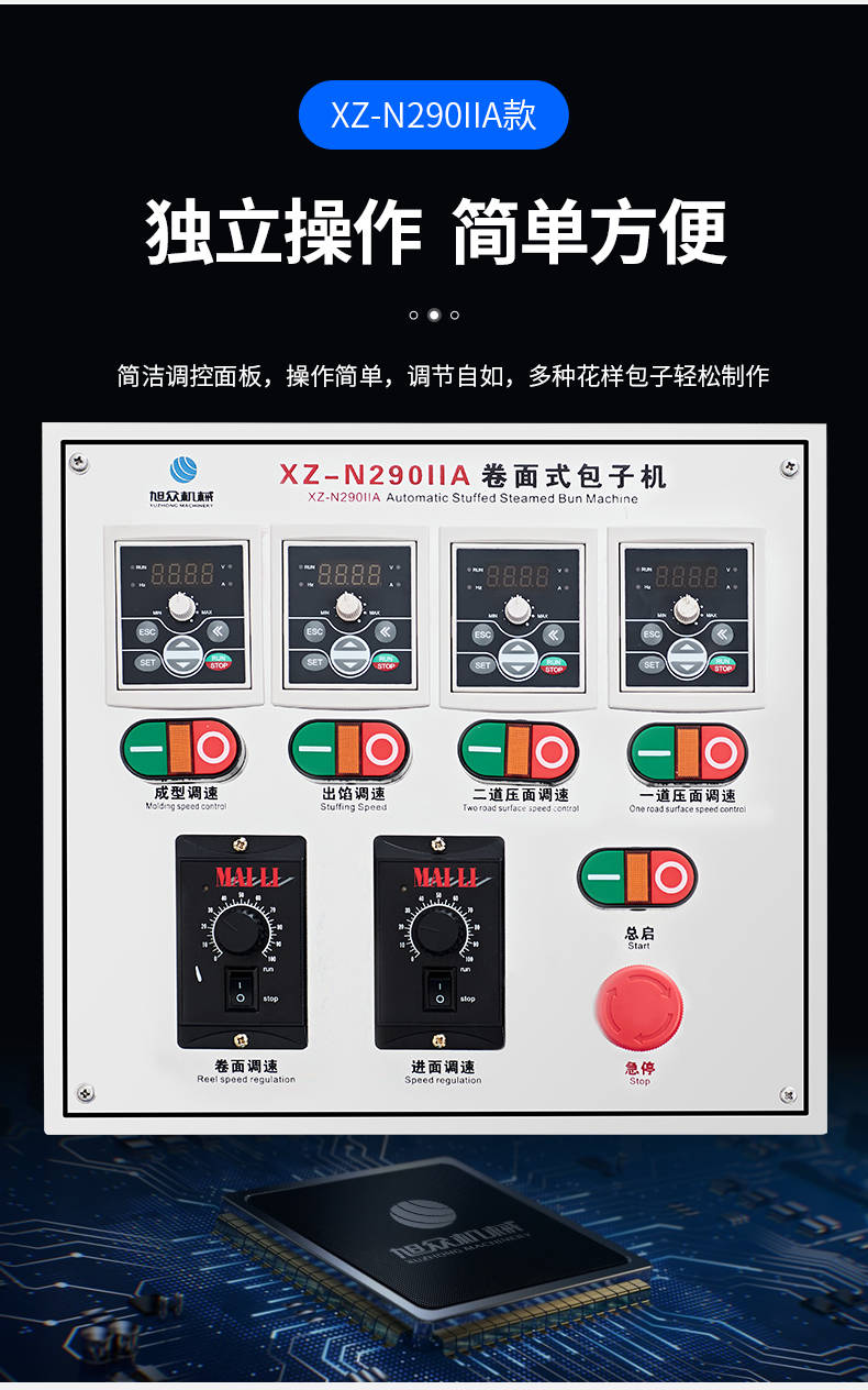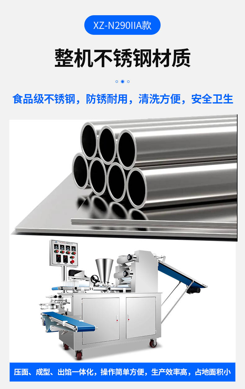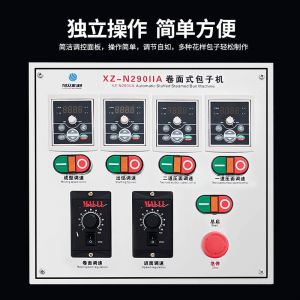 XZ-N290IIA卷面式包子機,壓面成型面皮,卷面方式包餡。仿手工捏花、一次成型、表面光滑、口感勁道。面餡可調、制品多樣。產品重量精度高,規格,大小,面皮的厚度皆可調控。