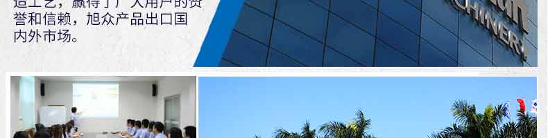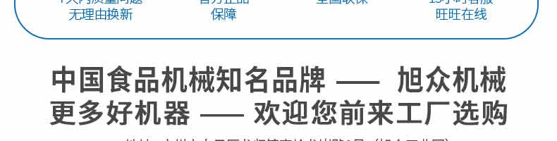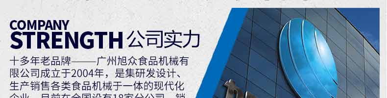 廣州旭眾食品機械有限公司是一家集科研開發(fā),生產(chǎn)設計,營銷服務為一體的現(xiàn)代化生產(chǎn)企業(yè)。現(xiàn)代化生產(chǎn)車間,精湛制造技術(shù),所產(chǎn)機械歷經(jīng)市場重重考驗,不斷贏得海內(nèi)外客戶的贊譽。