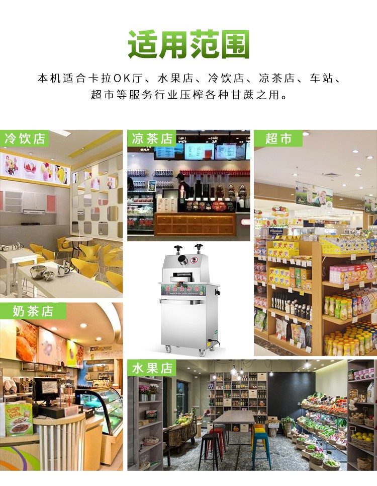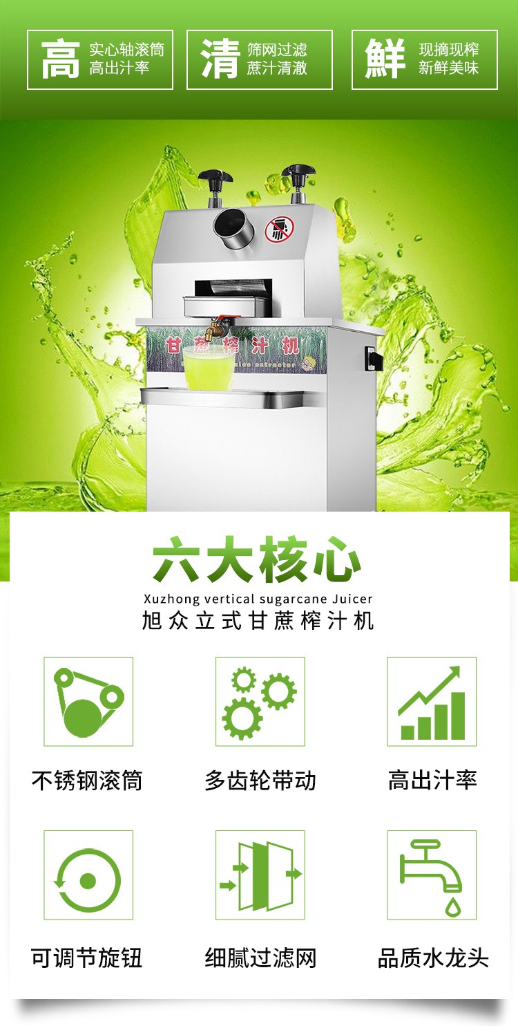 立式甘蔗機,該機采用不銹鋼材質加工,機頭部件都經過嚴格的防銹仿腐蝕處理,整機采用全封閉結構,可內置蔗渣桶,保證渣汁不外泄,安全、干凈、衛生。 適合賓館、卡拉OK廳、水果店、冷飲店、涼茶店、車站、超市等服務行業壓榨各種甘蔗之用。
