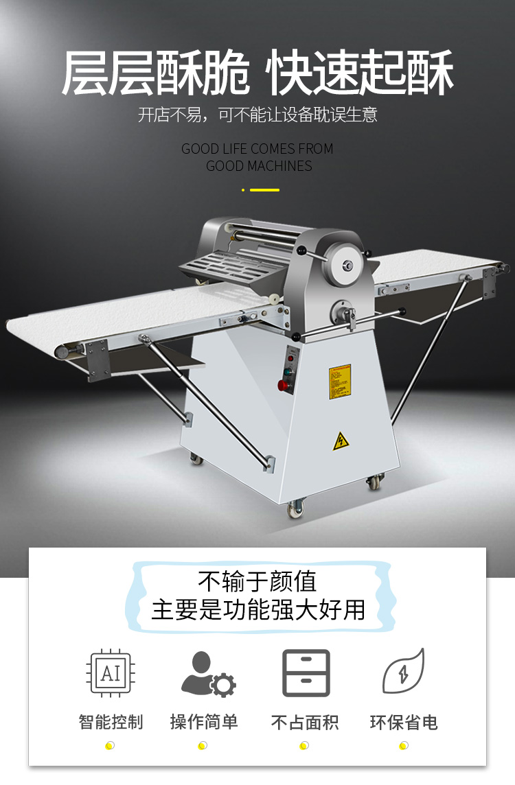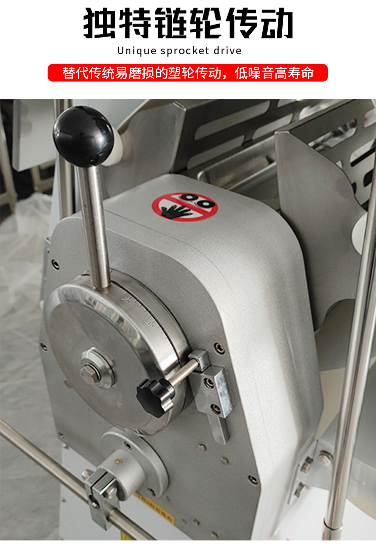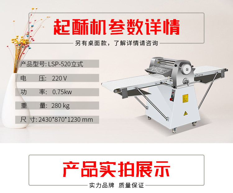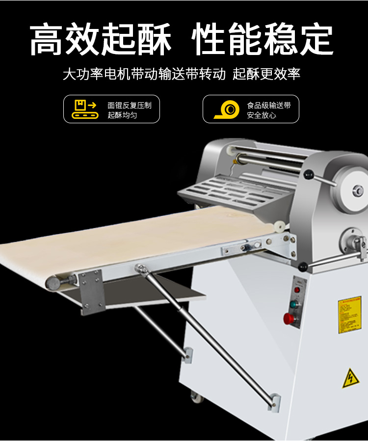 LSP-520酥皮機(jī),采用獨(dú)特的鏈輪傳動(dòng)替代了傳統(tǒng)易磨損的塑輪傳動(dòng),低噪音,高壽命滾輪經(jīng)過(guò)特殊工藝處理,不粘面,不易刮傷適用于手撕面包、羊角面包、蛋撻、老婆餅、千層餅,等酥皮類食品,也可用于輾壓面團(tuán)。
