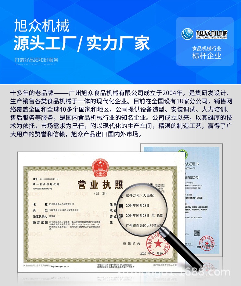 廣州旭眾食品機械有限公司是一家集科研開發,生產設計,營銷服務為一體的現代化生產企業。現代化生產車間,精湛制造技術,所產機械歷經市場重重考驗,不斷贏得海內外客戶的贊譽。