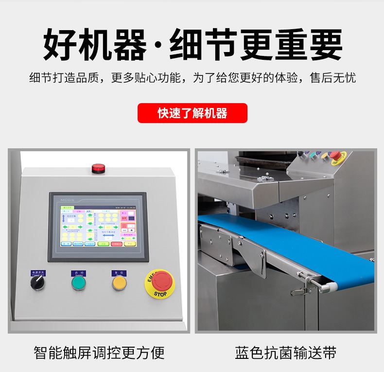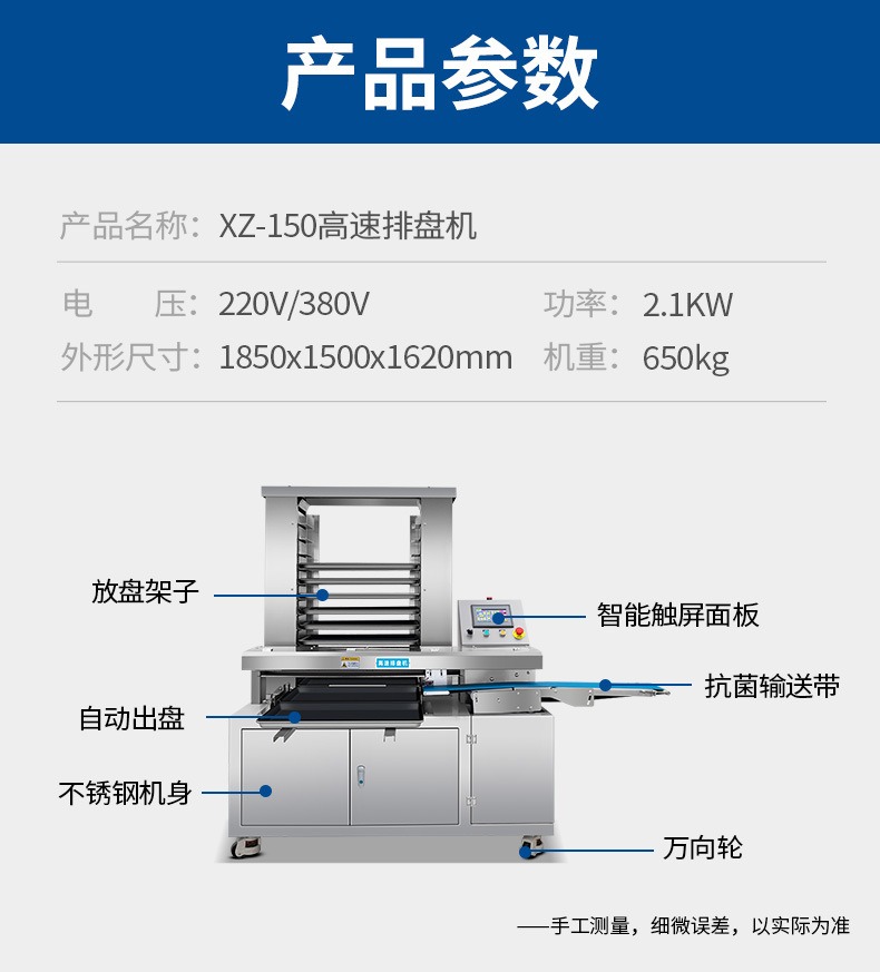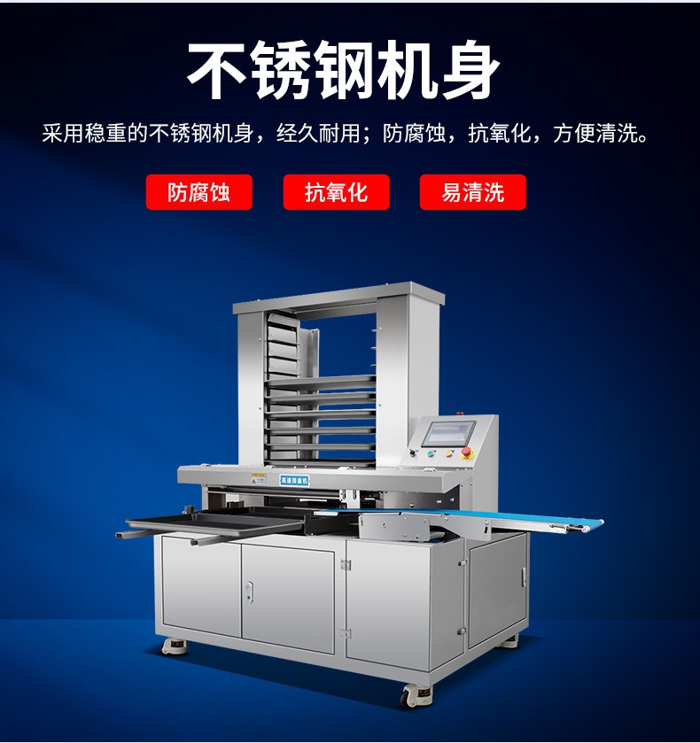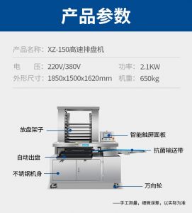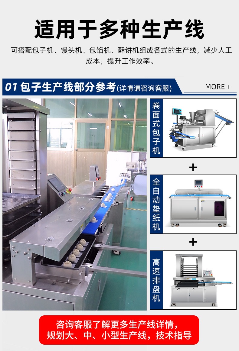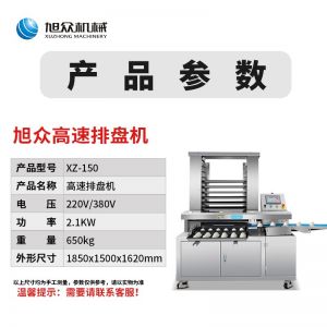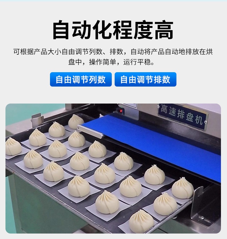 多功能商用高速排盤機,自動化程度高,可根據(jù)產品大小自由調節(jié)列數(shù)、排數(shù),自動將產品自動地排放在烘盤中,操作簡單,運行平穩(wěn)。智能觸屏面板。控制系統(tǒng)由三菱PLC和進口觸摸屏組成,操作簡單方便。具有故障自動診斷,一目了然。