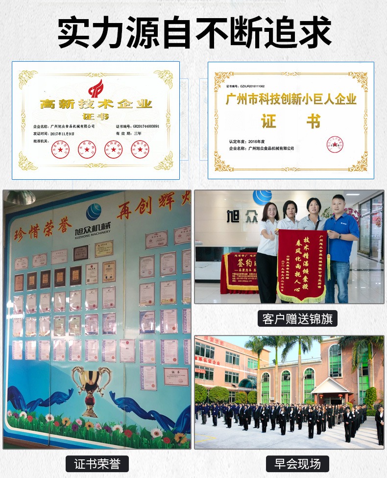 廣州旭眾食品機械有限公司是一家集科研開發(fā),生產設計,營銷服務為一體的現(xiàn)代化生產企業(yè)。現(xiàn)代化生產車間,精湛制造技術,所產機械歷經市場重重考驗,不斷贏得海內外客戶的贊譽。