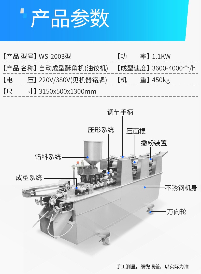 自動成型油餃機,創業商用、省時省力。適用于制作酥角、油餃。3000-4000每小時大產量。省力快速,做酥角、油餃的神器。自動撒粉 不粘機器。面粉均勻漏下,面皮不粘黏機器。