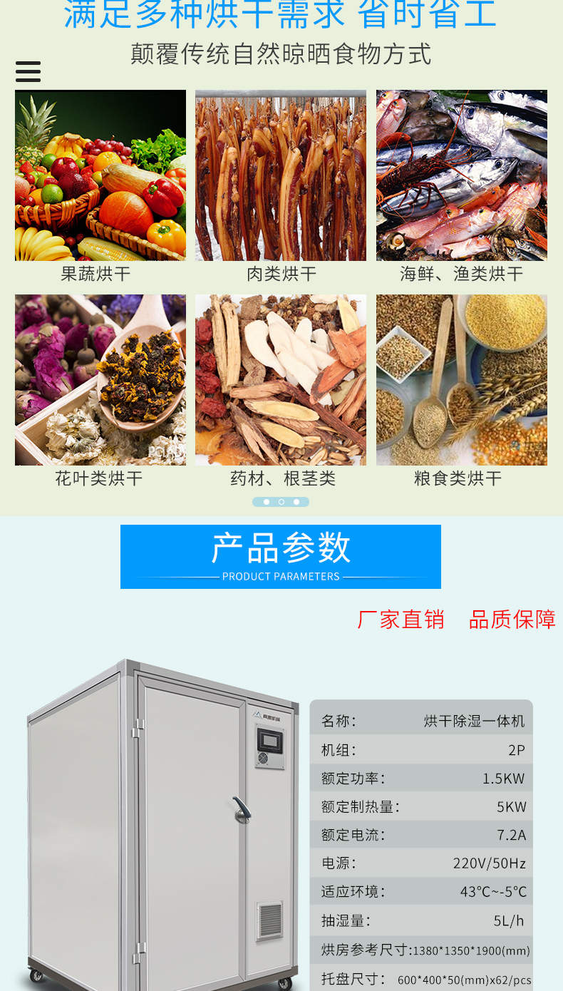 烘干除濕一體機,烘干除濕體機,智能觸屏精準控溫熱風循環均勻烘干次可烘干500斤,智能烘干時代出類拔萃的新體驗,1度電能=4度,熱能比傳統電加熱。干燥設備減少60%以上電能消耗。