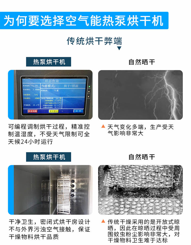 030S-T-KD06空氣能烘干機,可編程調制烘干過程,精準控制溫濕度,不受天氣限制可全天候24小時運行。干凈衛生,密閉式烘干房設計不與外界污濁空氣接觸,保證干燥物料烘干品質。高效節能,不用專人看守,可實現一人同時管理多間烘房減少人工費用