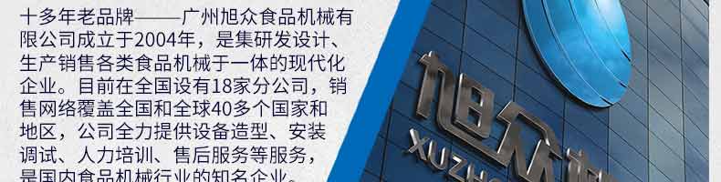 廣州旭眾食品機械有限公司是一家集科研開發(fā),生產(chǎn)設計,營銷服務為一體的現(xiàn)代化生產(chǎn)企業(yè)?,F(xiàn)代化生產(chǎn)車間,精湛制造技術,所產(chǎn)機械歷經(jīng)市場重重考驗,不斷贏得海內(nèi)外客戶的贊譽。