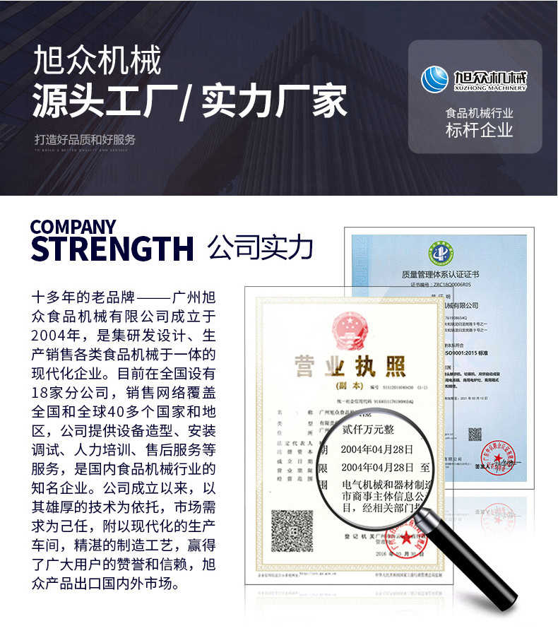 廣州旭眾食品機械有限公司是一家集科研開發,生產設計,營銷服務為一體的現代化生產企業。現代化生產車間,精湛制造技術,所產機械歷經市場重重考驗,不斷贏得海內外客戶的贊譽。