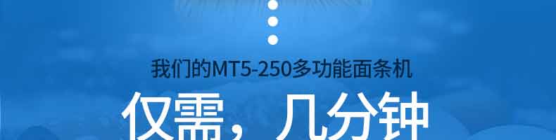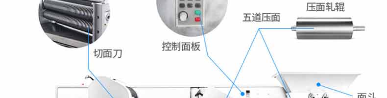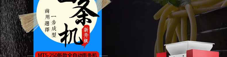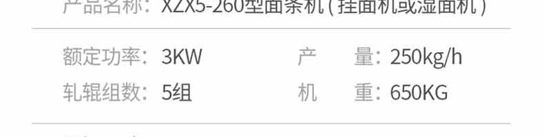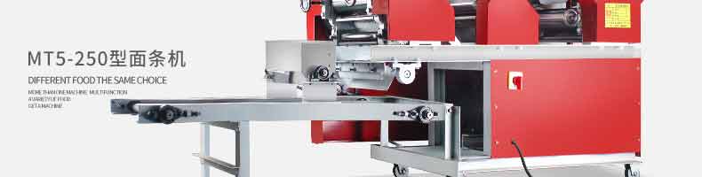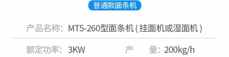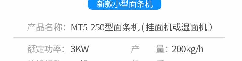 名稱MT5-250型面條機 電源220V 功率 產量200kg/h 尺寸2300*600*1400mm 重量450kg 規格 其他軋輥組數:五組;軋輥尺寸:98*260mm