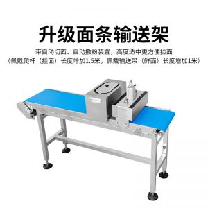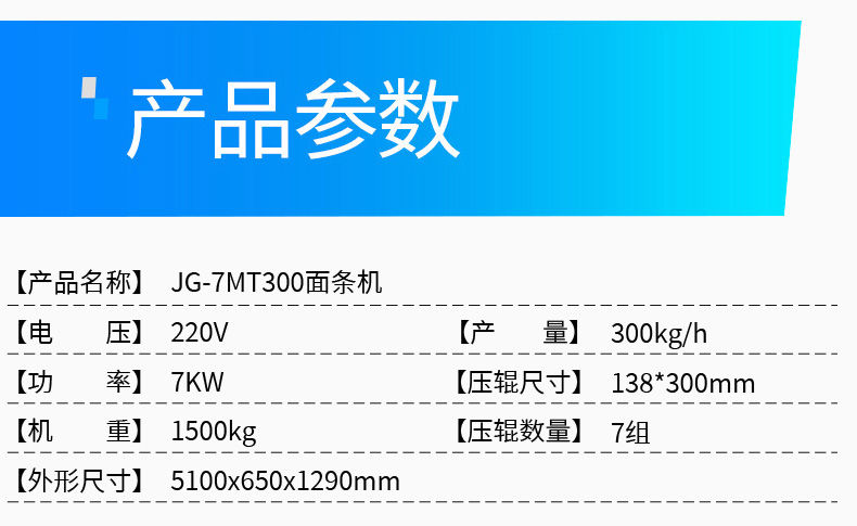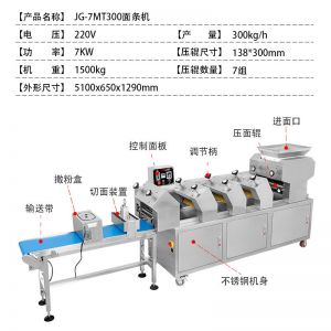 名稱JG-7MT300面條機 電源220V 功率7KW 產量300kg/h 尺寸5100×650X1290mm 重量1500kg 規格請資詢銷售員 其他