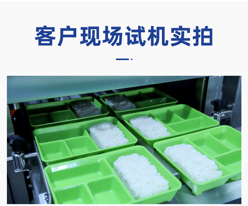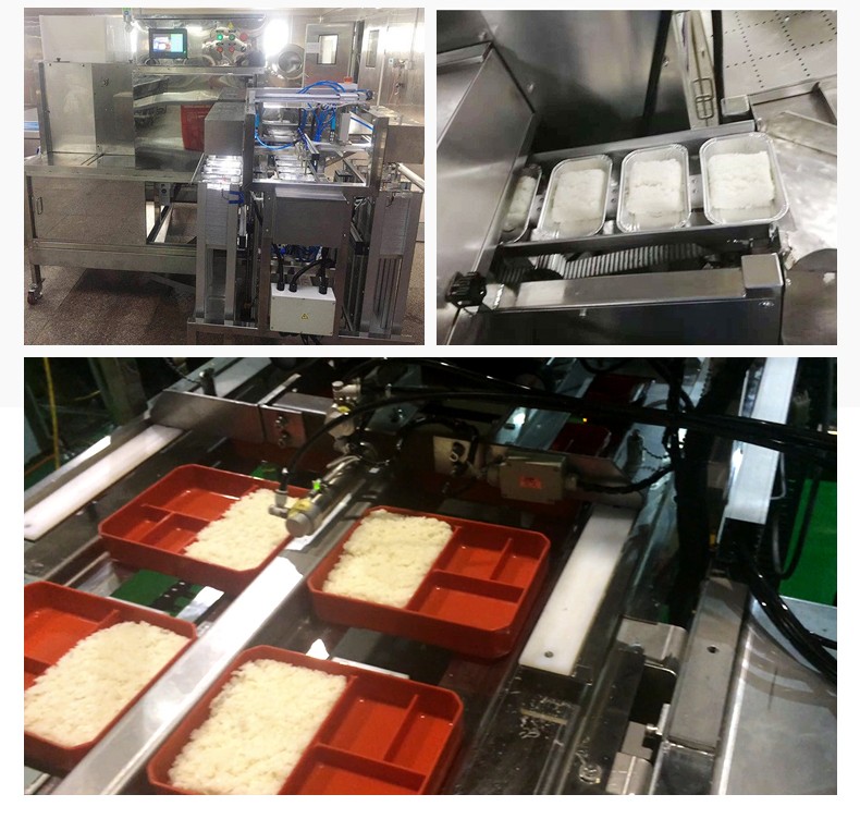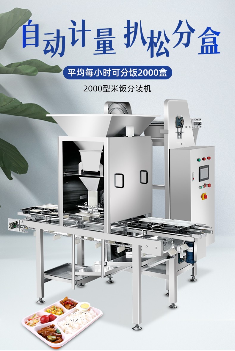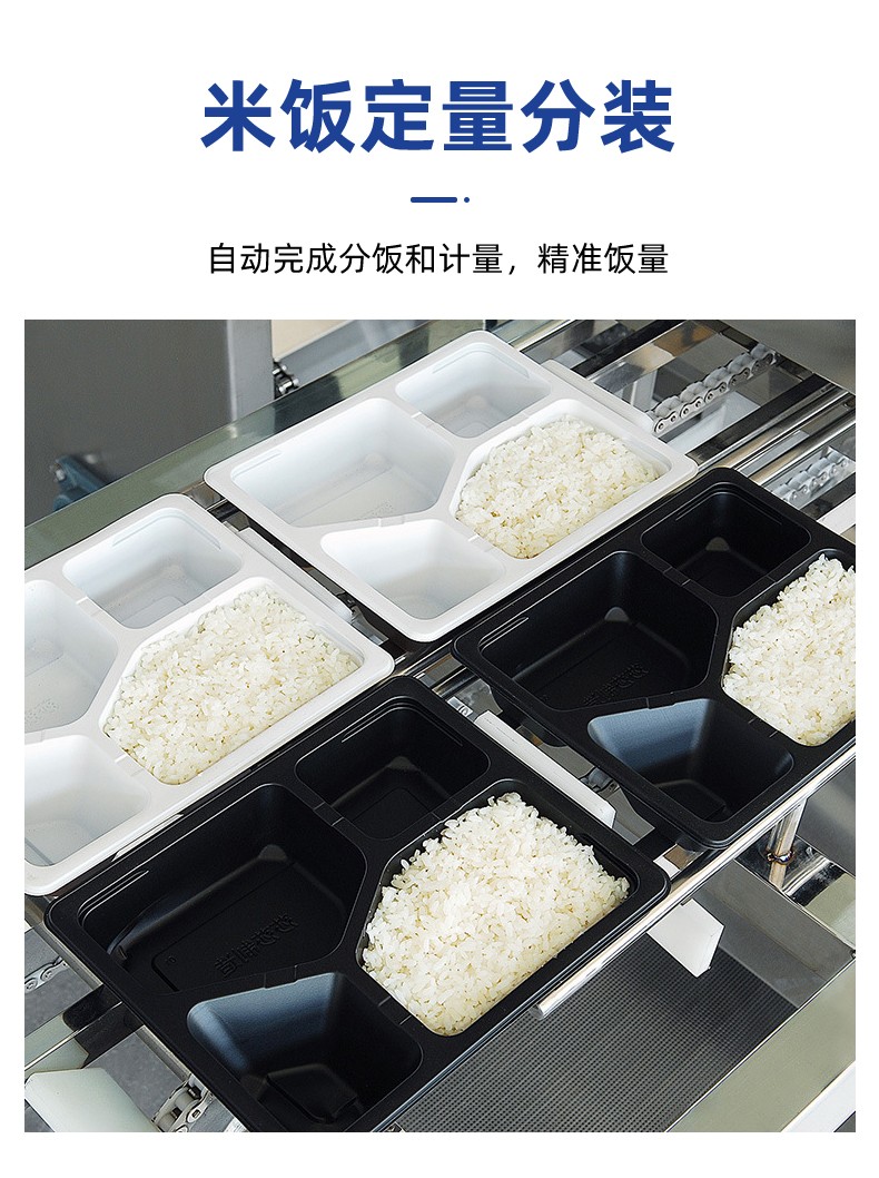 米飯分裝機,適用多場合大型米飯加工中心、快餐公司、大型配餐中心企事業單位、學校食堂、釀造企業。米飯定量分裝,自動完成分飯和計量,精準飯量。米飯先扒松再分盒,能將米飯扒松分盒,使米飯更加松軟可口。