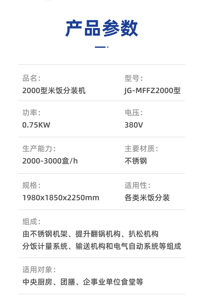 名稱米飯分裝機 電源380V 功率0.75KW 產量2000-3000盒/h 尺寸1980X1850X2250mm 重量請咨詢銷售員 規格請咨詢銷售員 其他