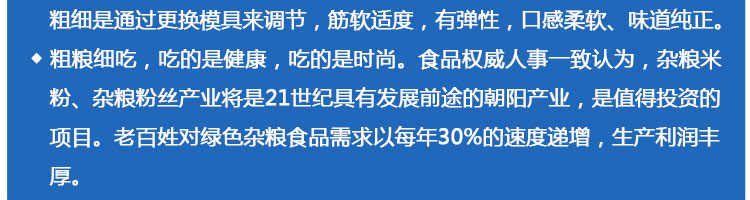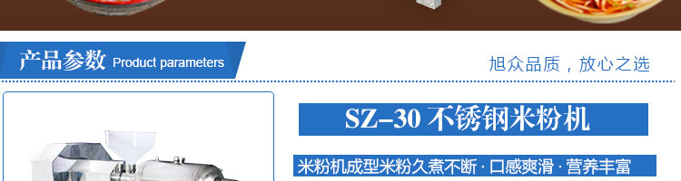 SZ-30不銹鋼米粉機,可生產米粉、米線、桂林米粉、過橋米線、年糕、糍粑等產品。各種形狀都可生產(圓、扁),加工食品外表光滑,厚薄、寬窄、粗細均勻可調,筋軟適度,有彈性,口感柔軟、味道純正。