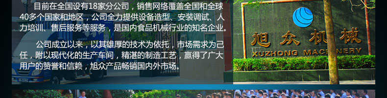 廣州旭眾食品機械有限公司是一家集科研開發,生產設計,營銷服務為一體的現代化生產企業。現代化生產車間,精湛制造技術,所產機械歷經市場重重考驗,不斷贏得海內外客戶的贊譽。