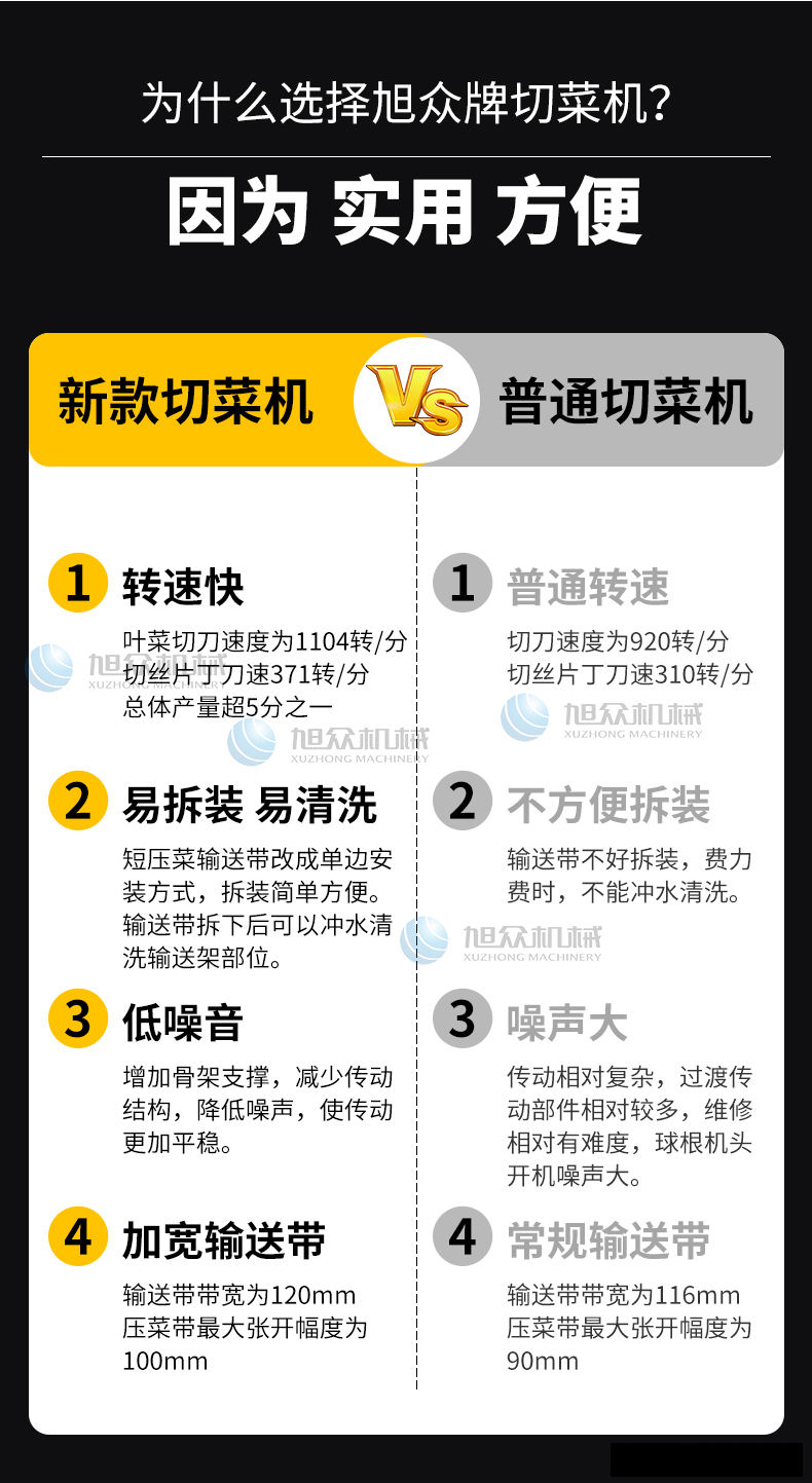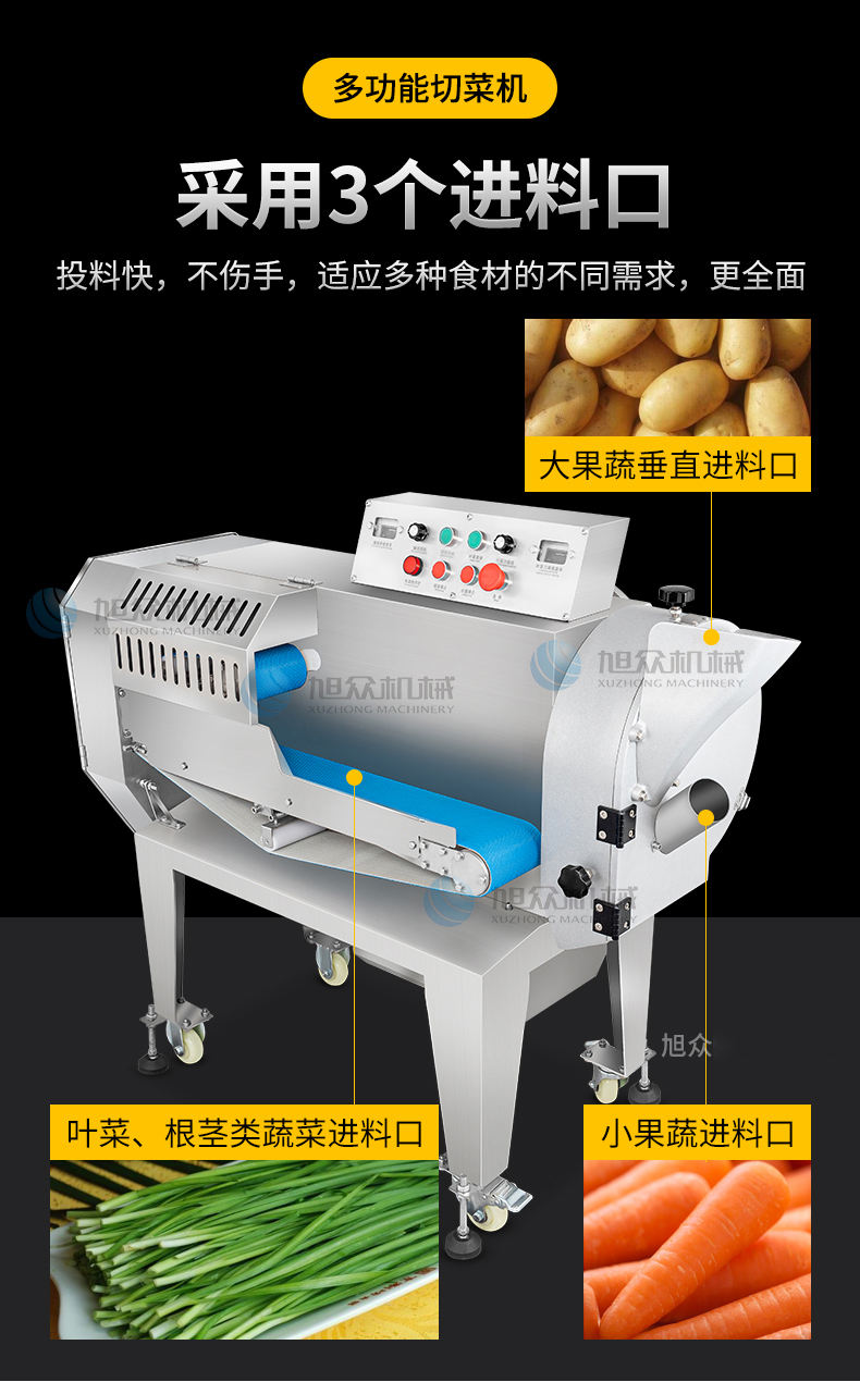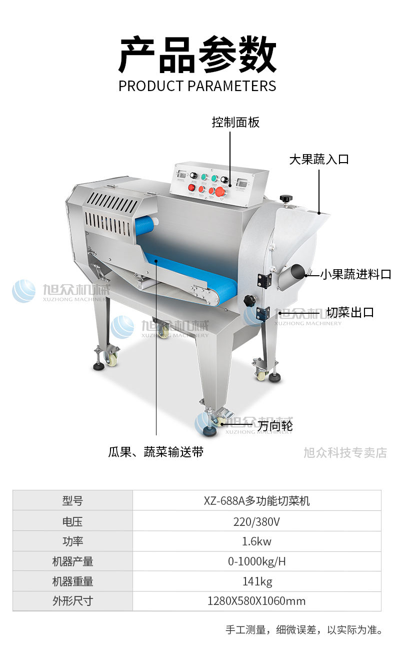 XZ-688A切菜機,占地使用面積小機器小,省空間,適合飯店、食堂、酒店等使用。省事省力省人工1小時加工2000斤葉菜切刀速度為1104轉/分,切絲、切片、切丁、刀速371轉/分。