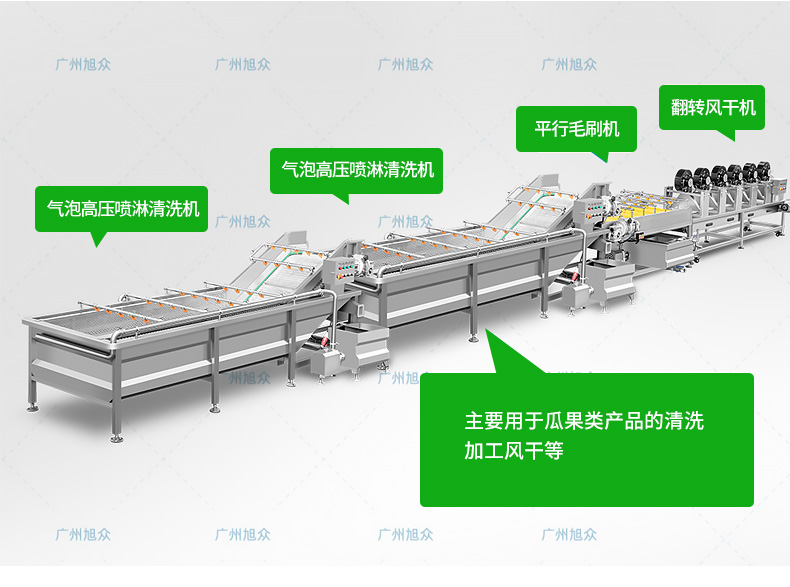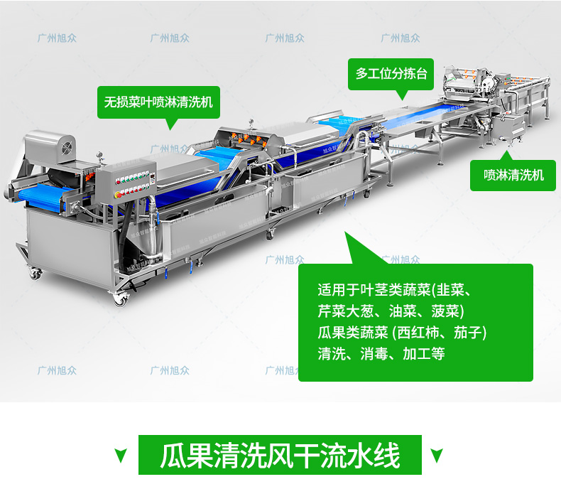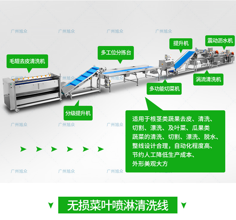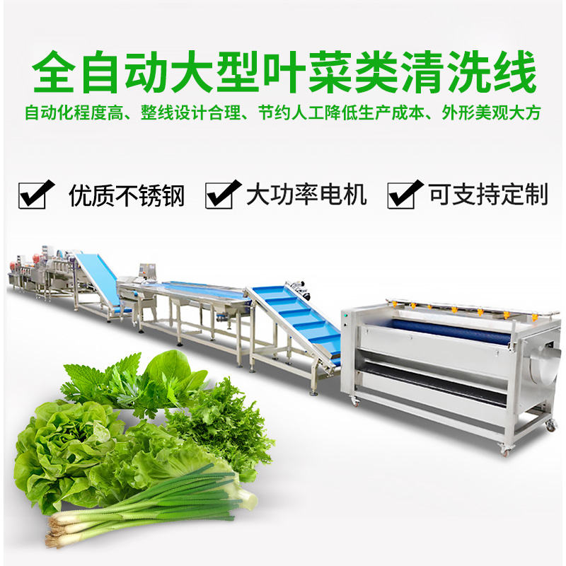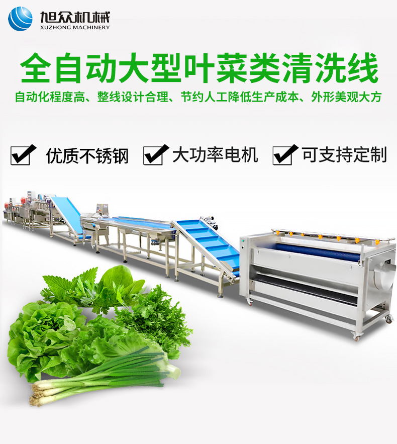 全自動大型葉菜清洗線,自動化程度高、整線設計合理、節約人工降低生產成本、外形美觀大方。主要用于葉菜加工,整線自動化凈菜生產此線將切割、清洗、風干設備連接成線,適合芹菜、韭菜菠菜、大白菜高麗菜、大蔥等葉菜類蔬菜加工生產