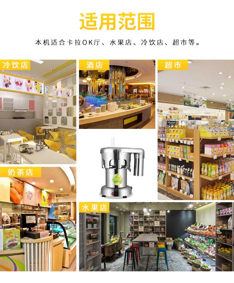 WF-A2000商用榨汁機,該機所榨出的汁液是現榨的原汁,不含任何人為的防腐劑、穩定劑、色素、香精、水等,凡與榨汁接觸的原件均為不銹鋼和無毒塑料聚丙烯和 A.B.S,食用安全。