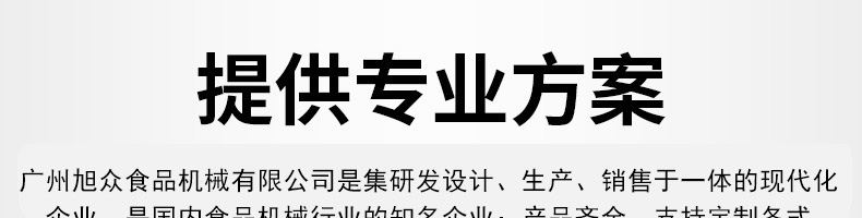 廣州旭眾食品機械有限公司是一家集科研開發,生產設計,營銷服務為一體的現代化生產企業。現代化生產車間,精湛制造技術,所產機械歷經市場重重考驗,不斷贏得海內外客戶的贊譽。