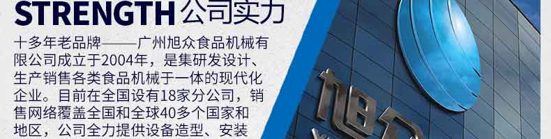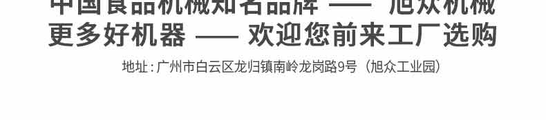 廣州旭眾食品機械有限公司是一家集科研開發(fā),生產(chǎn)設計,營銷服務為一體的現(xiàn)代化生產(chǎn)企業(yè)。現(xiàn)代化生產(chǎn)車間,精湛制造技術(shù),所產(chǎn)機械歷經(jīng)市場重重考驗,不斷贏得海內(nèi)外客戶的贊譽。