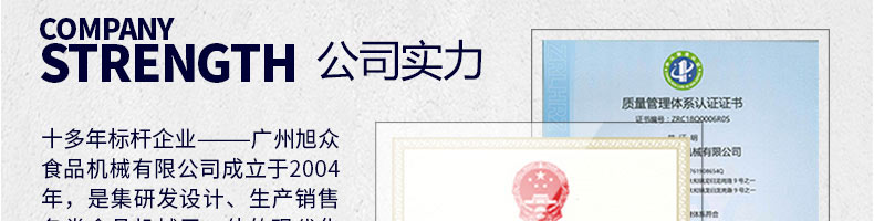 廣州旭眾食品機械有限公司是一家集科研開發(fā),生產(chǎn)設(shè)計,營銷服務(wù)為一體的現(xiàn)代化生產(chǎn)企業(yè)。現(xiàn)代化生產(chǎn)車間,精湛制造技術(shù),所產(chǎn)機械歷經(jīng)市場重重考驗,不斷贏得海內(nèi)外客戶的贊譽。